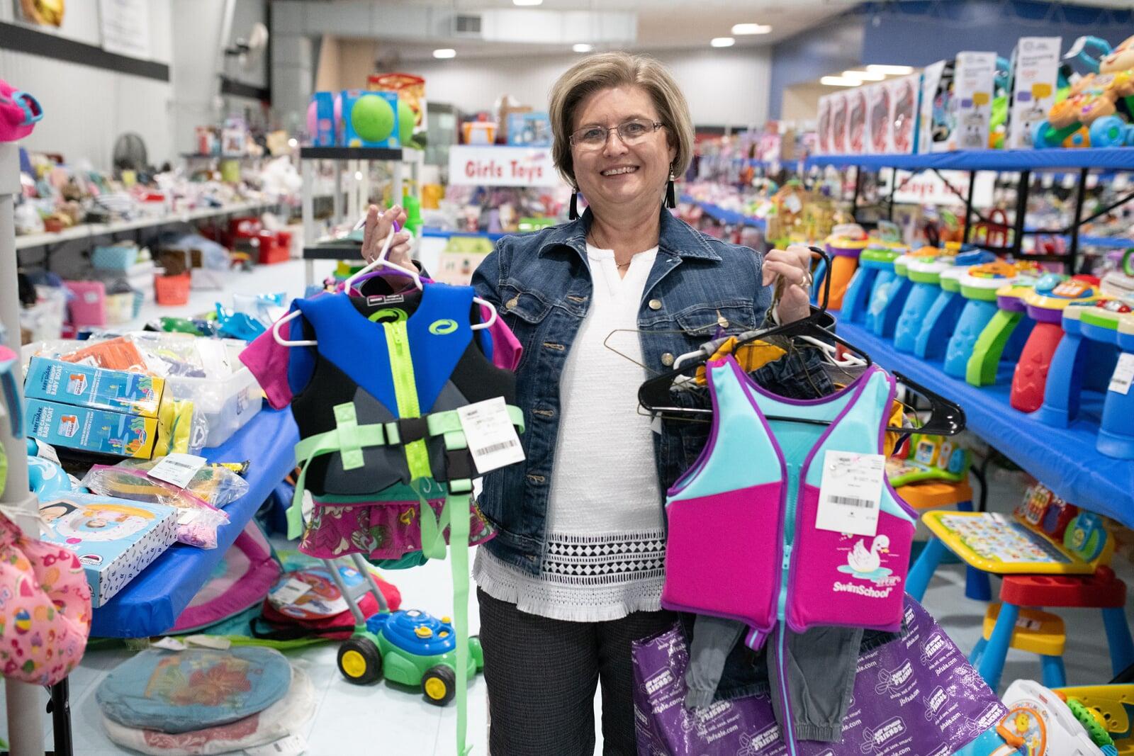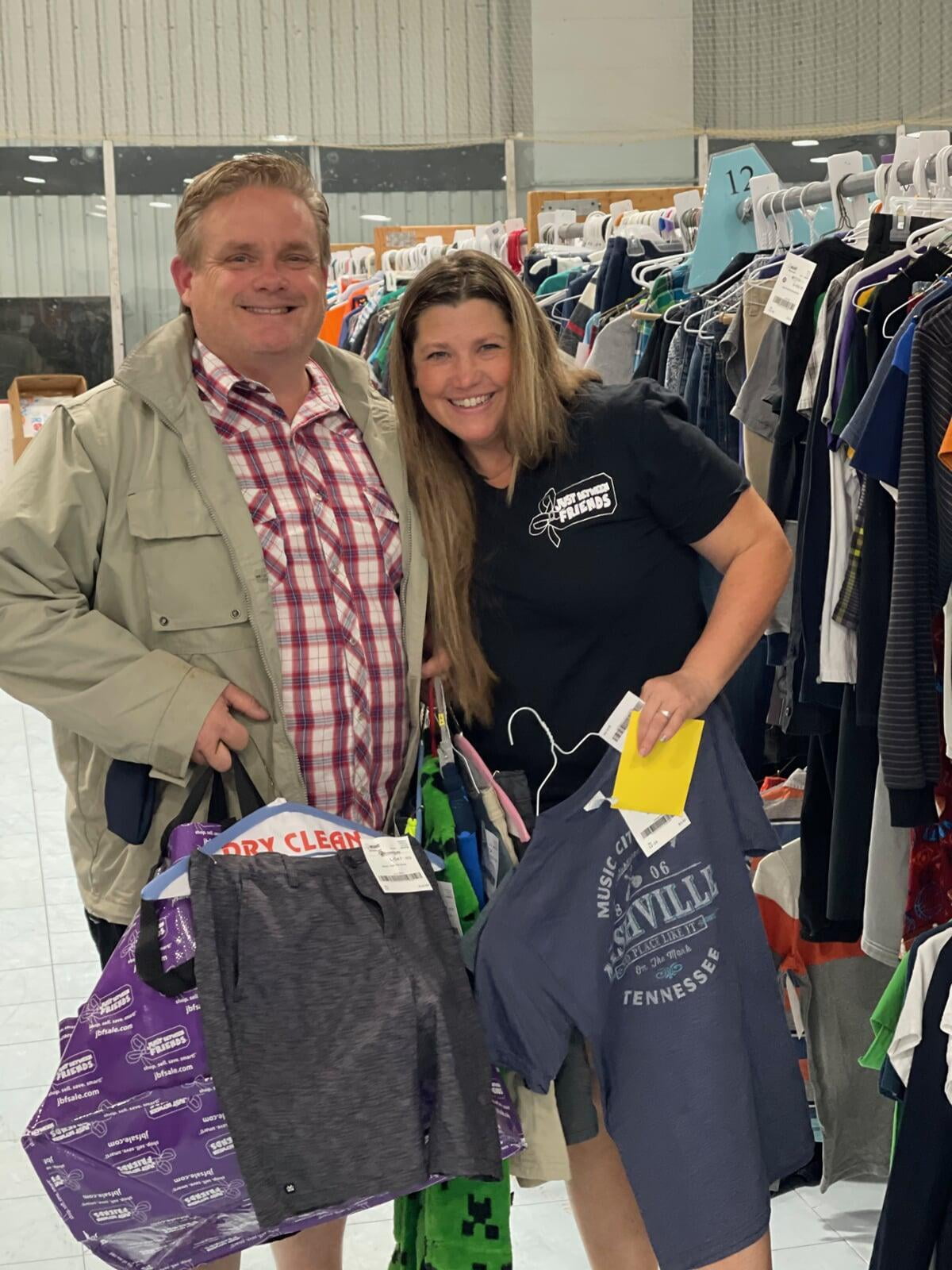 A mom and grandmother stand beside a rack of clothing at a JBF sale in Texas.
