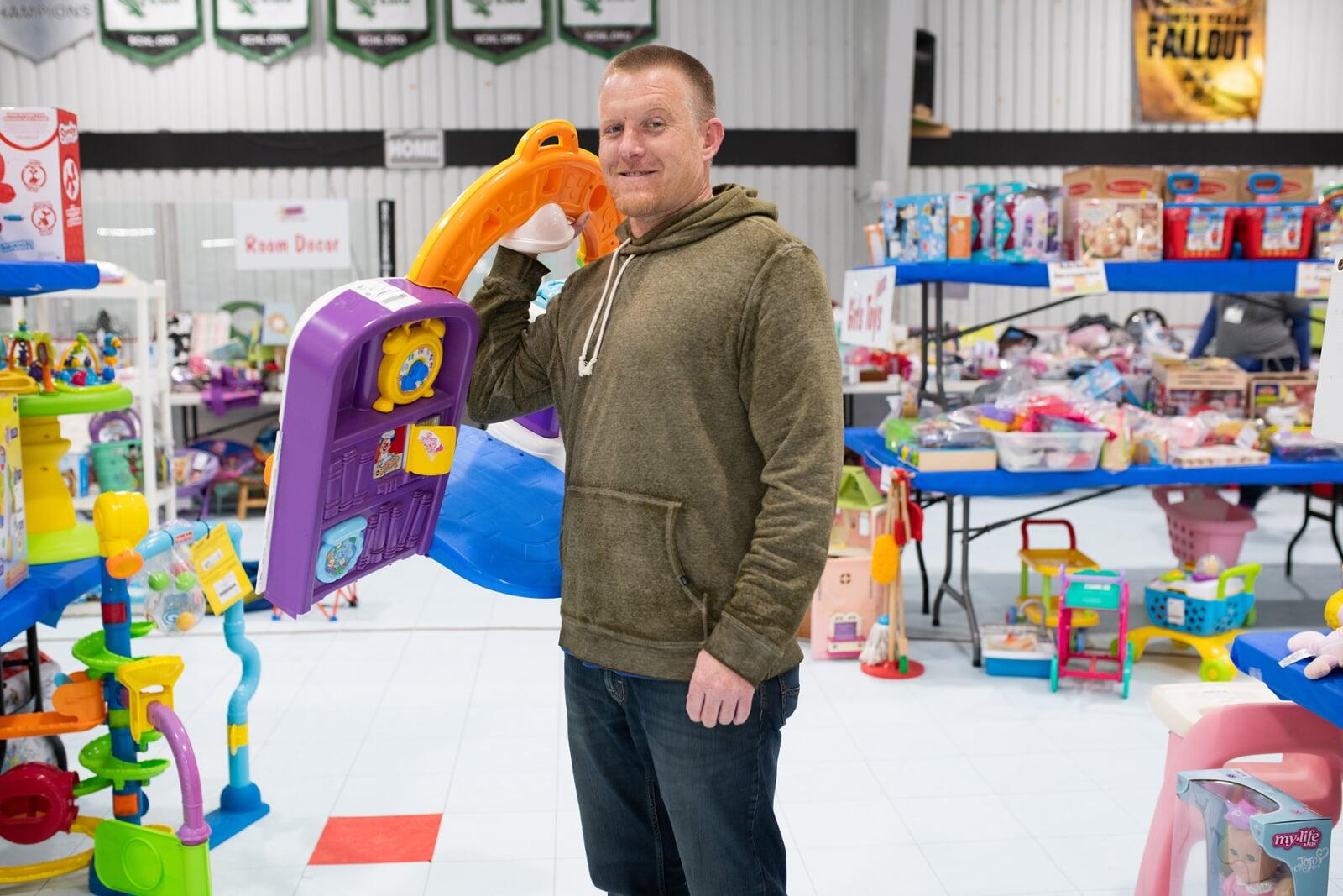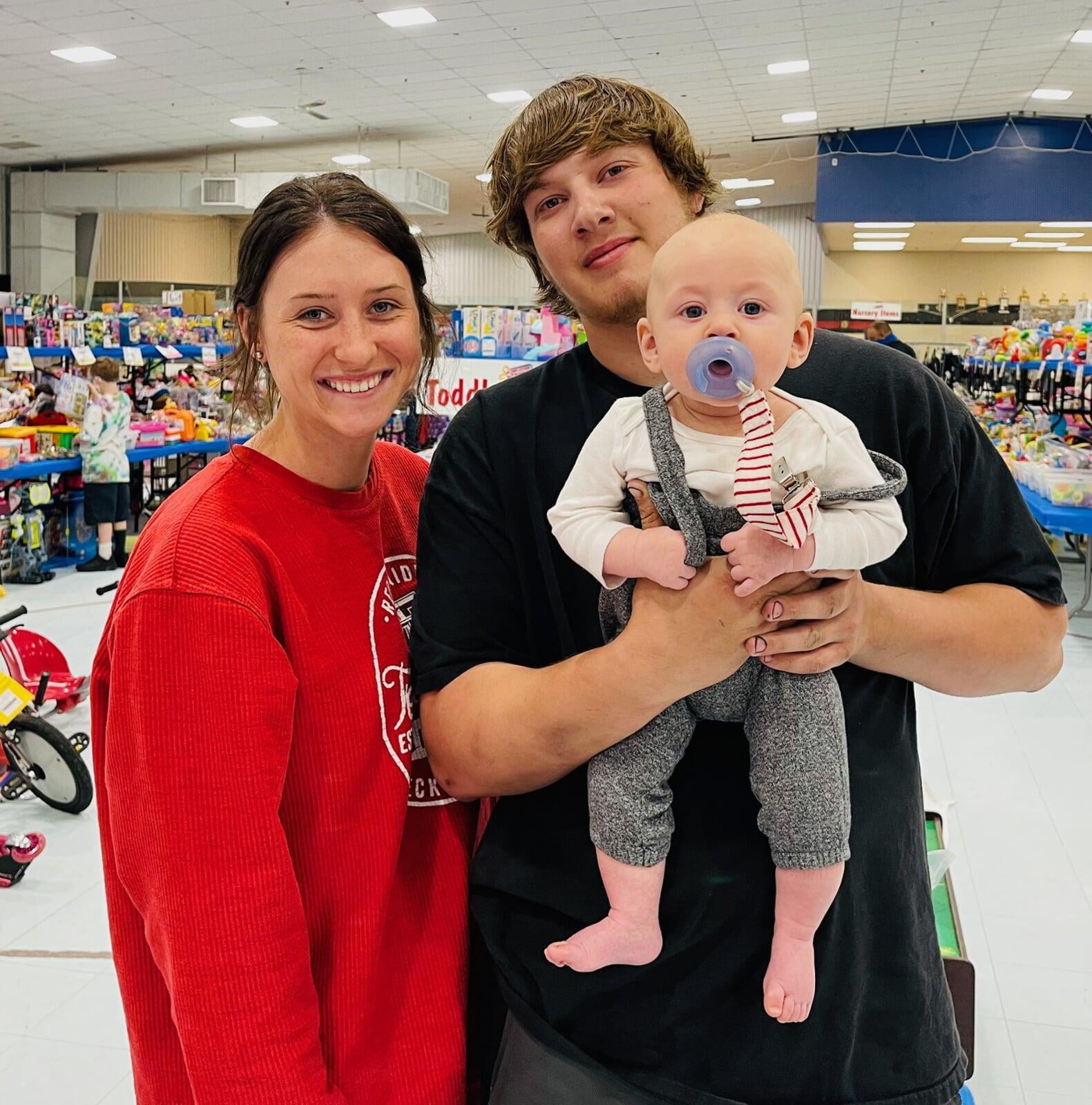 A mom with a large JBF shopping bag on her shoulder stands beside her husband who wears their toddler at a JBF sale.